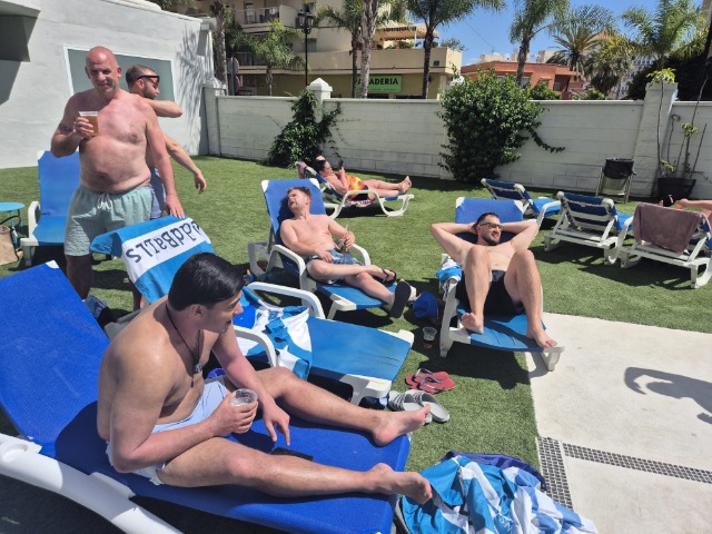 After celebrating with our hosts and the other opposition and after eating an excellent paella and some empanada, and drinking a wheelie bin full of beer we headed back into Fuengirola. Chad got a bit spicy with the first time tourists, and Charlie got a bit aggressive.